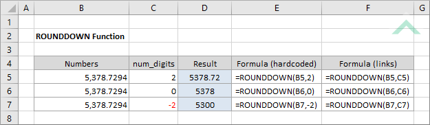The excel rounddown rounds a number down, to a specific number of places from the decimal point.